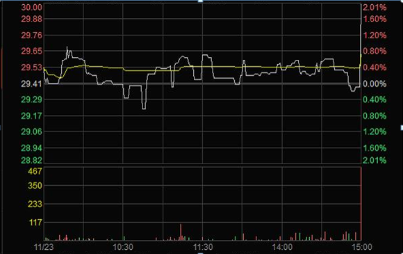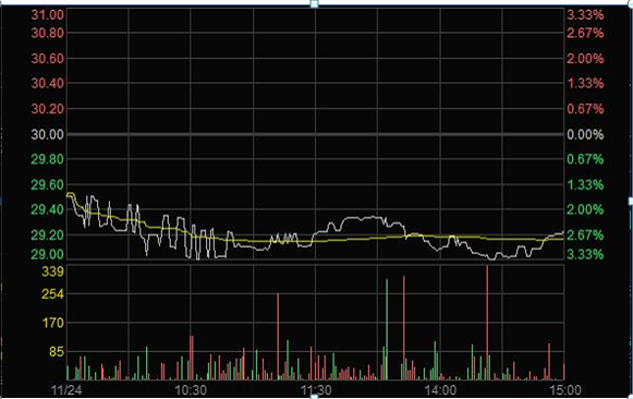 2011年11月23日臨近收盤期間(14:56:24至14:59:28),任某某為了在短期內拉升股價,大量申報買入“X”4筆共計63,000股,占尾市階段市場申買量的比例高達75.54%;委托價格由29.60元升至32.00元,每筆均高于當時市場上的買1檔價格,三分鐘內將股價由29.35元拉升至30元收盤,拉升幅度達2.21%。(見下圖)